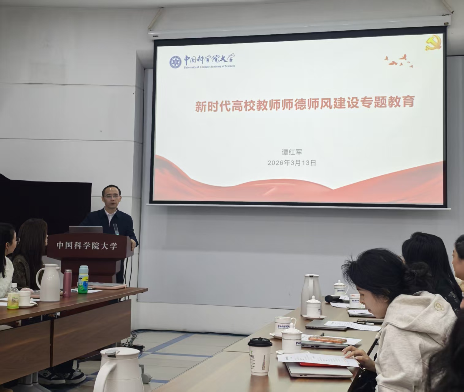 2026年3月13日,国科大马克思主义学院教师党支部召开党员大会,学习师德师风警示教育,全体教师党员参会,群众列席,支部书记陈天嘉支持会议。