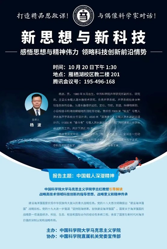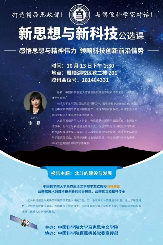 《新思想与新科技课程》是国科大马克思主义学院打造的精品思政课品牌,共设置8个专题授课模块,聚焦基础前沿、人工智能、量子信息、空天科学等研究领域,旨在深入学习贯彻习近平总书记关于科技创新的重要论述,由思政课教授与优秀科学家讲授新思想、新科技与科学家精神,引导学生深刻领略科技创新前沿,传承弘扬“两弹一星”精神,在迈向新征程中自觉肩负科技强国的使命担当。课程已邀请中国工程院院士、神舟号飞船首任总设计师戚发轫,中国科学院空天信息创新研究院研究员徐颖,中国科学院声学研究所副所长杨波开展授课。